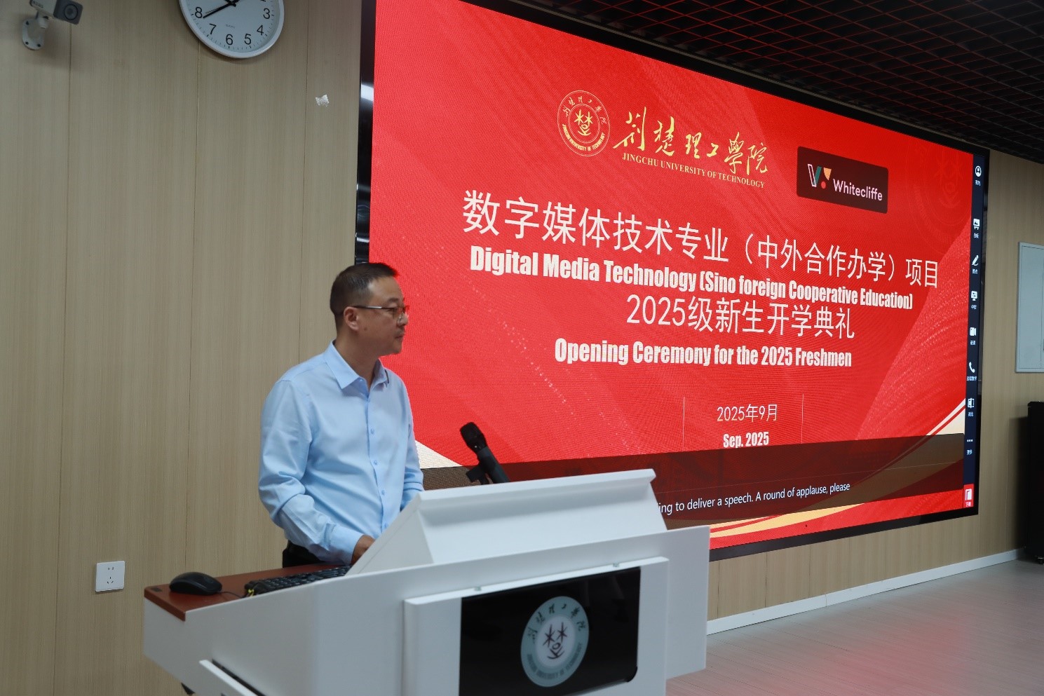 吾辈立潮头,扬帆正其时。此次开学典礼不仅是一场热烈的欢迎仪式,更是两校深化合作、共谋发展的新起点。它标志着我校中外合作办学事业迈上新台阶,对于提升学校国际化办学水平、培养具有全球竞争力的高素质人才具有重要意义。 出席典礼的还有怀特克里夫学院亚洲区招生办主任迟美健女士,我校人工智能学院、国际交流与合作处相关负责人及项目相关教师。