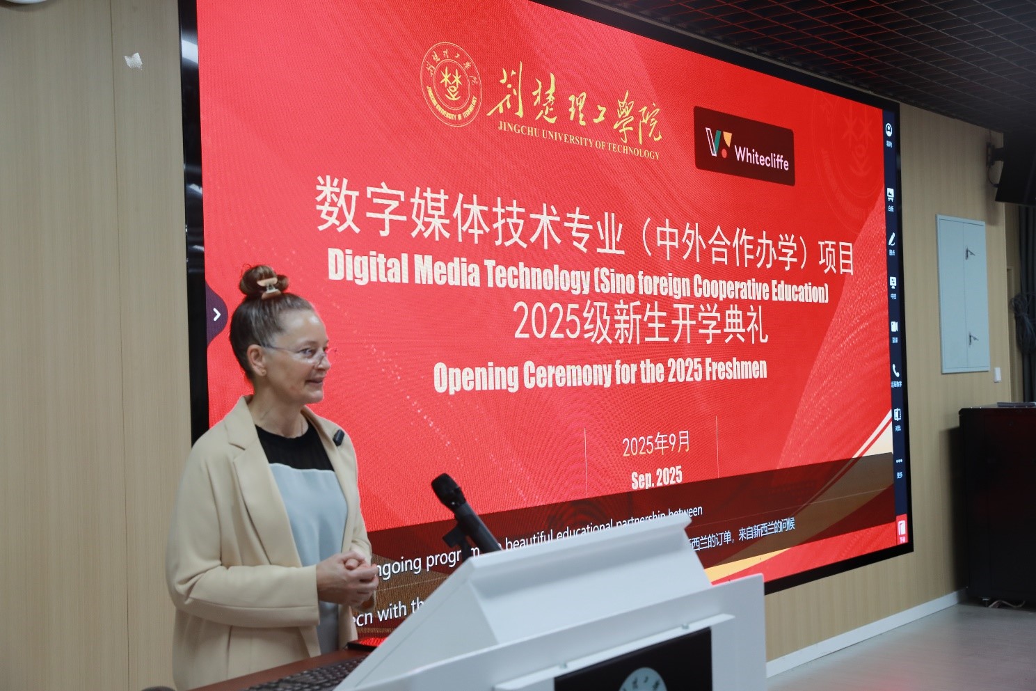 秋高气爽,丹桂飘香。9月18日上午,人工智能学院数字媒体技术(中外合作办学)专业2025级新生开学典礼在B4-205隆重举行。副校长谭新玉致欢迎辞。新西兰怀特克里夫学院校长Fay Amaral出席典礼。
